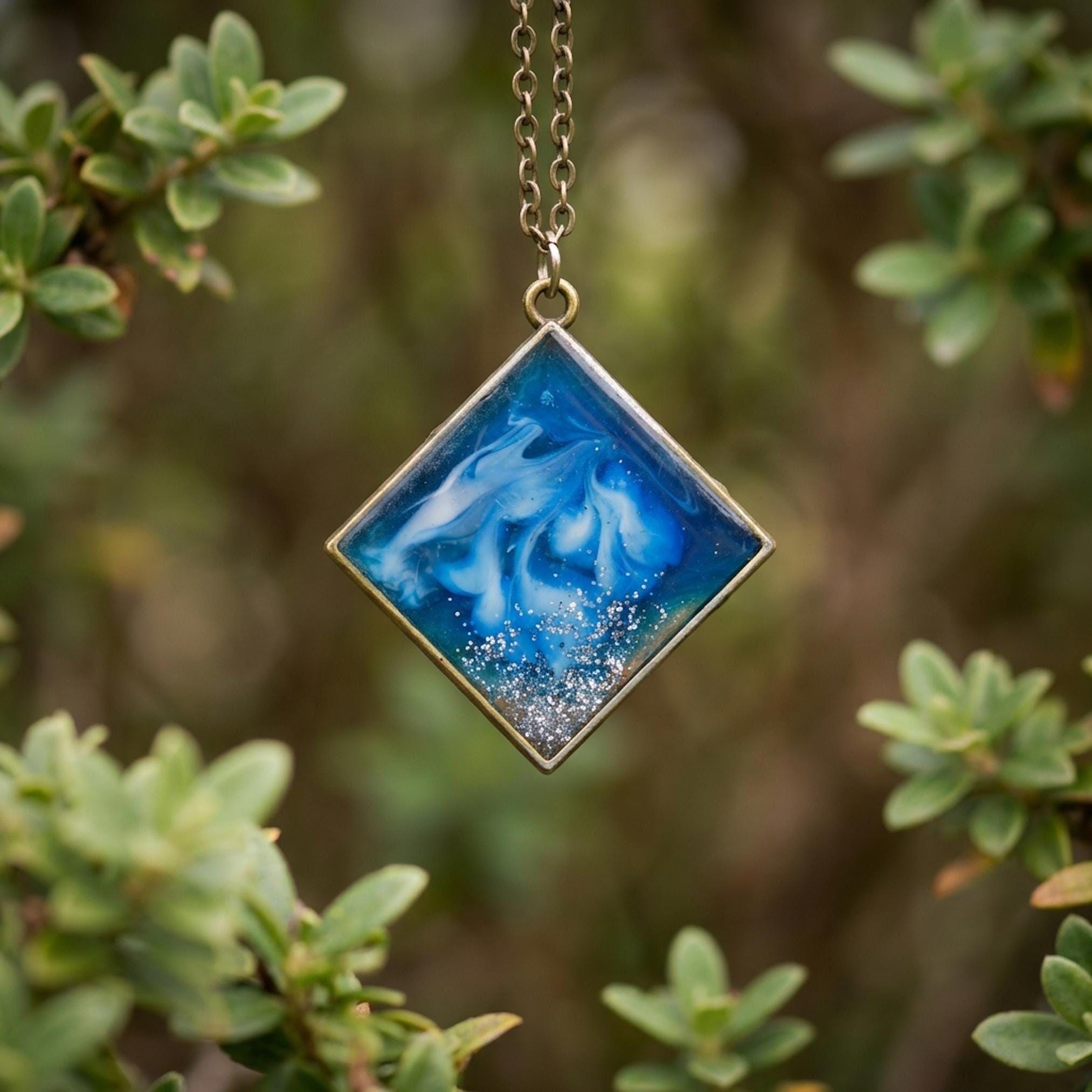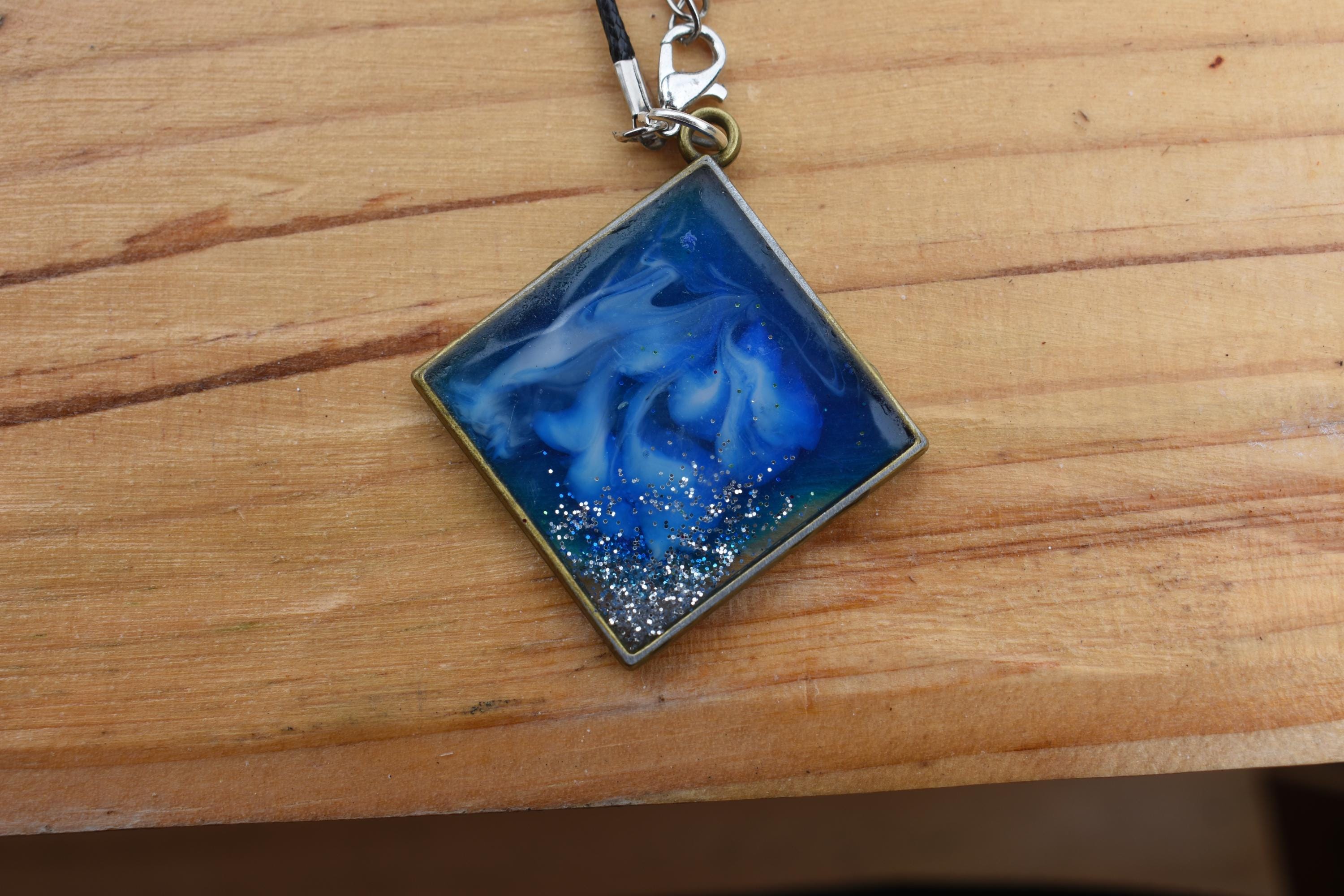 The design features a modern square resin charm set in a sleek silver bezel pendant. The inks blend inside the resin like swirling water, giving you a subtle blue marble necklace effect that feels like wearable ink art jewelry.