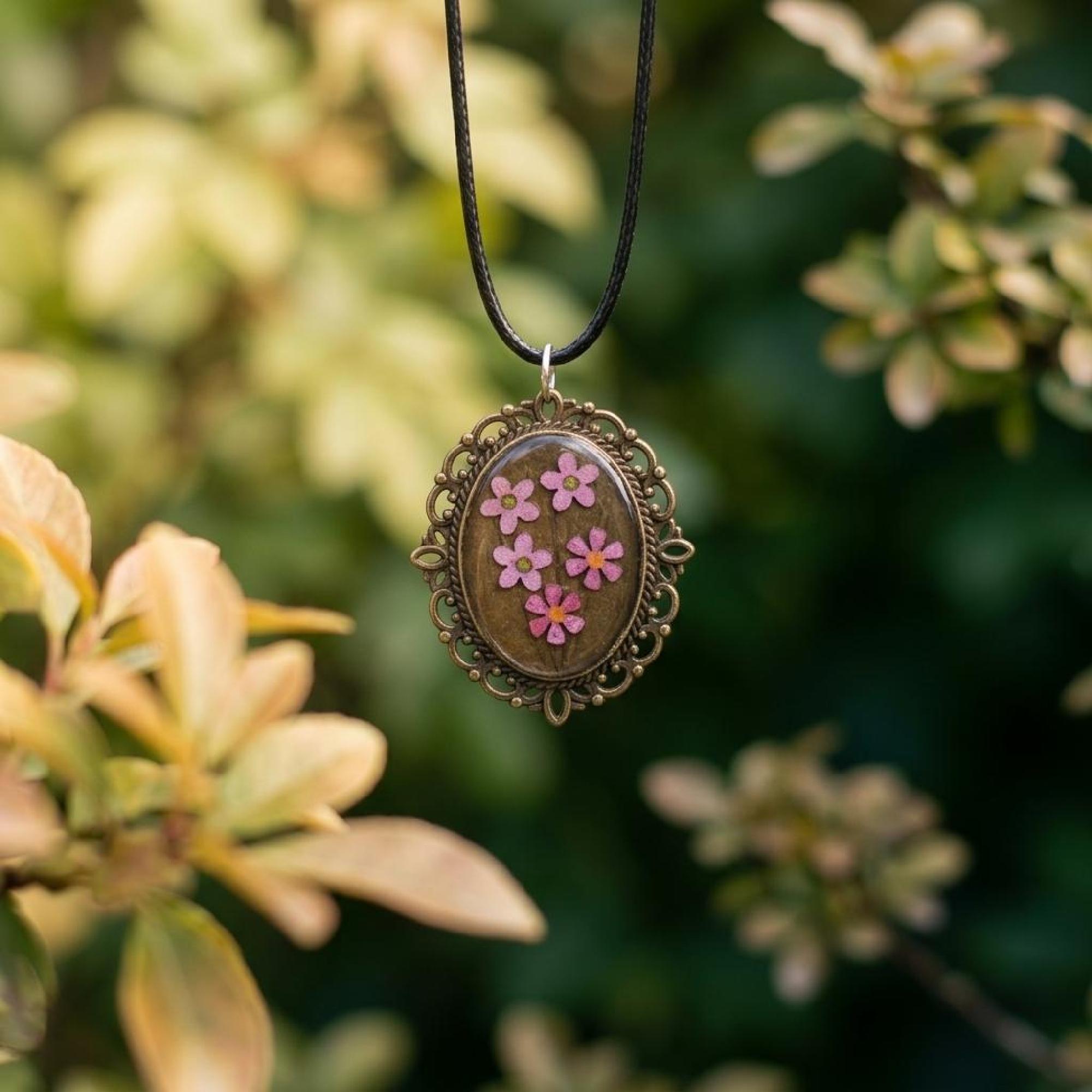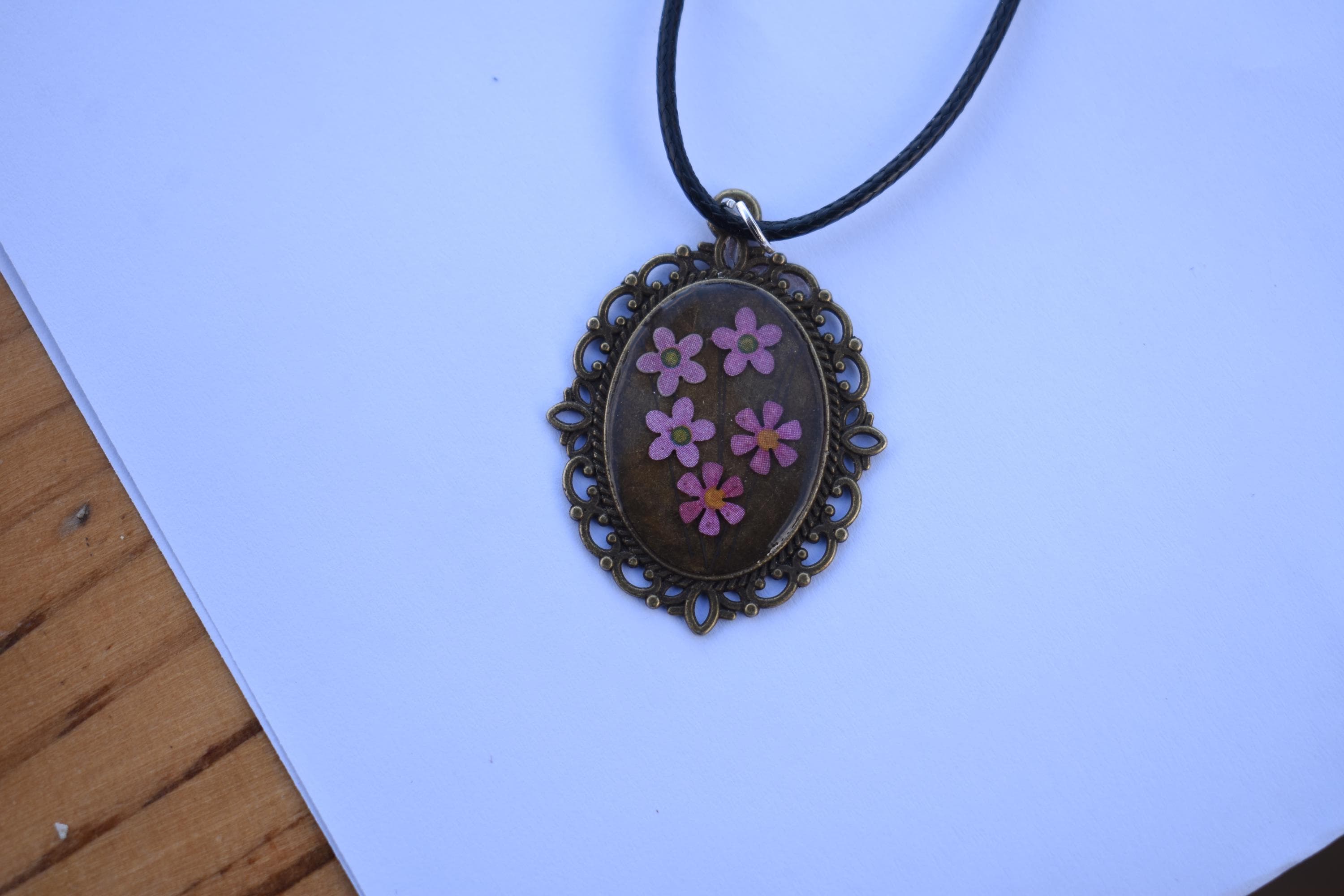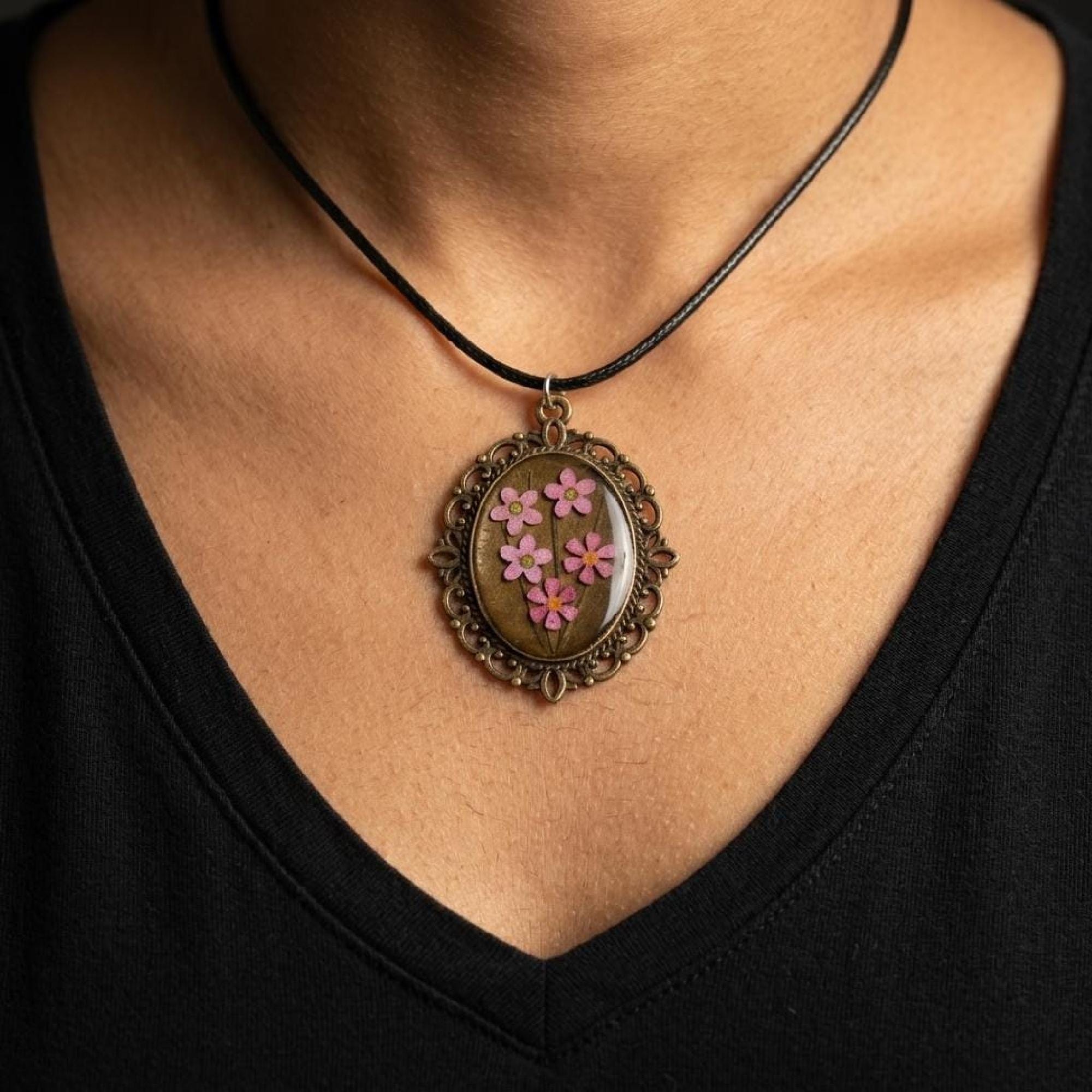 Invite a little elegance into your jewelry collection with this floral resin pendant, crafted to be cherished and worn often. pink flower pendant, uv resin necklace, oval floral pendant, vintage bronze charm, handmade floral gift, flower lover gift, valentine gift her, bronze bezel pendant, dainty flower charm, black cord necklace, romantic keepsake, pink blossom charm, oval charm necklace