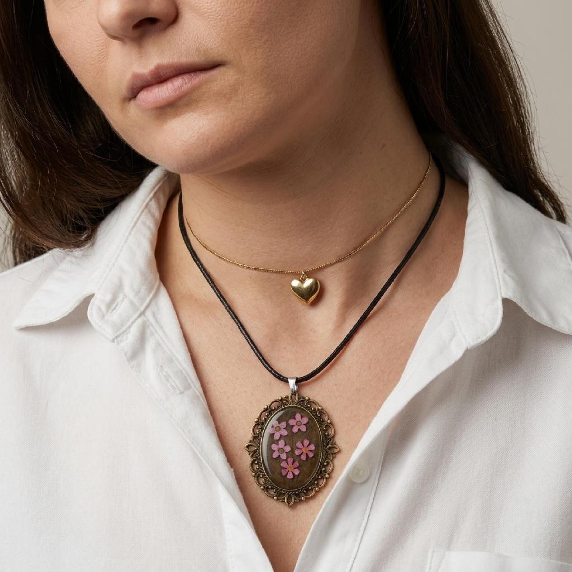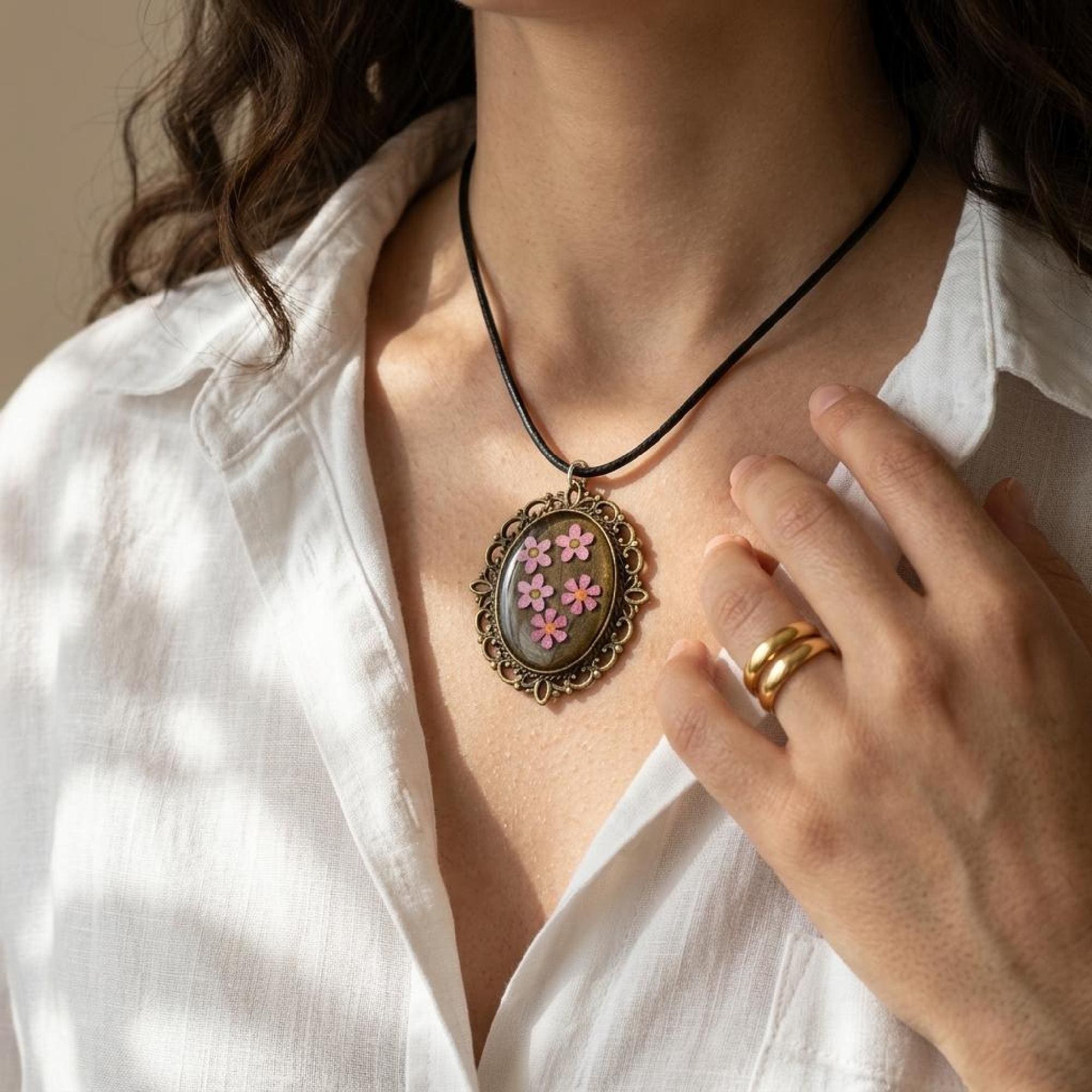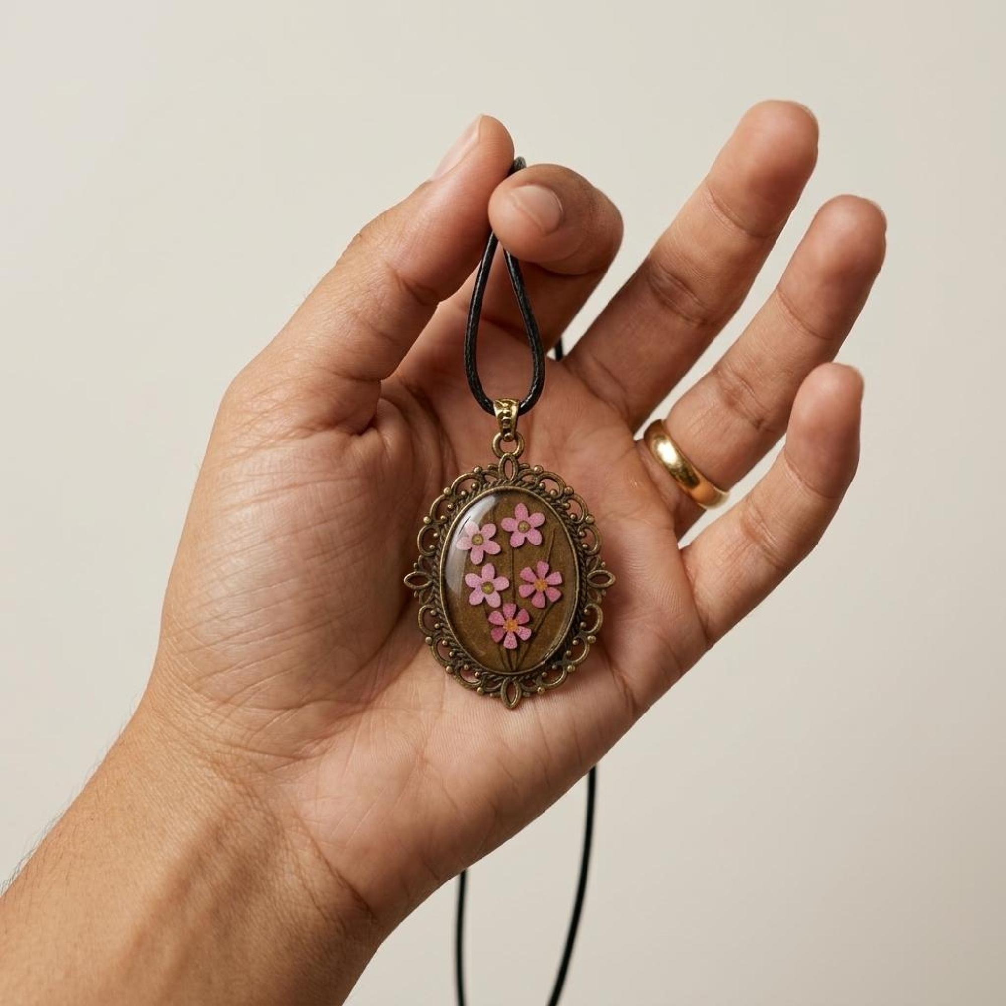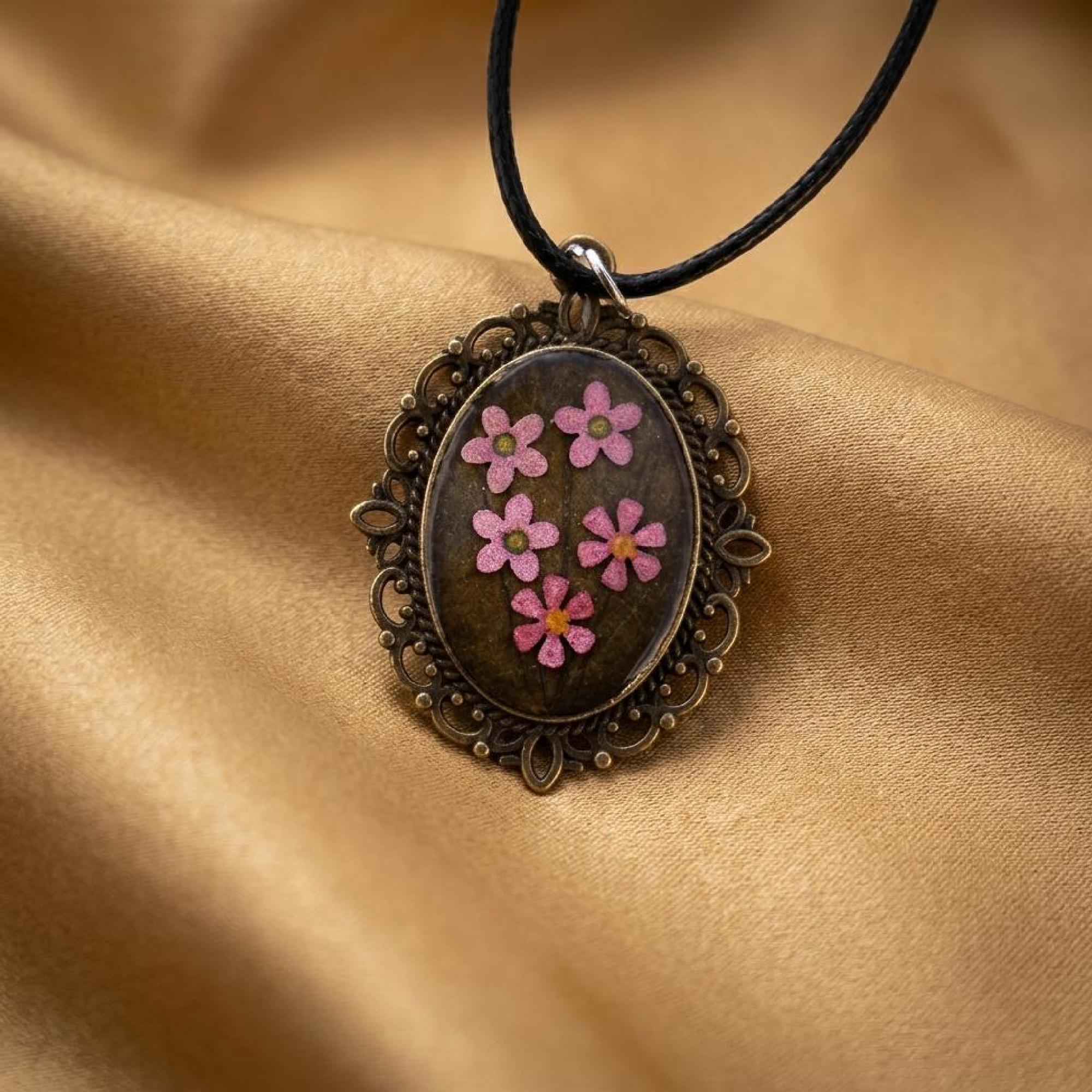 Invite a little elegance into your jewelry collection with this floral resin pendant, crafted to be cherished and worn often. pink flower pendant, uv resin necklace, oval floral pendant, vintage bronze charm, handmade floral gift, flower lover gift, valentine gift her, bronze bezel pendant, dainty flower charm, black cord necklace, romantic keepsake, pink blossom charm, oval charm necklace
