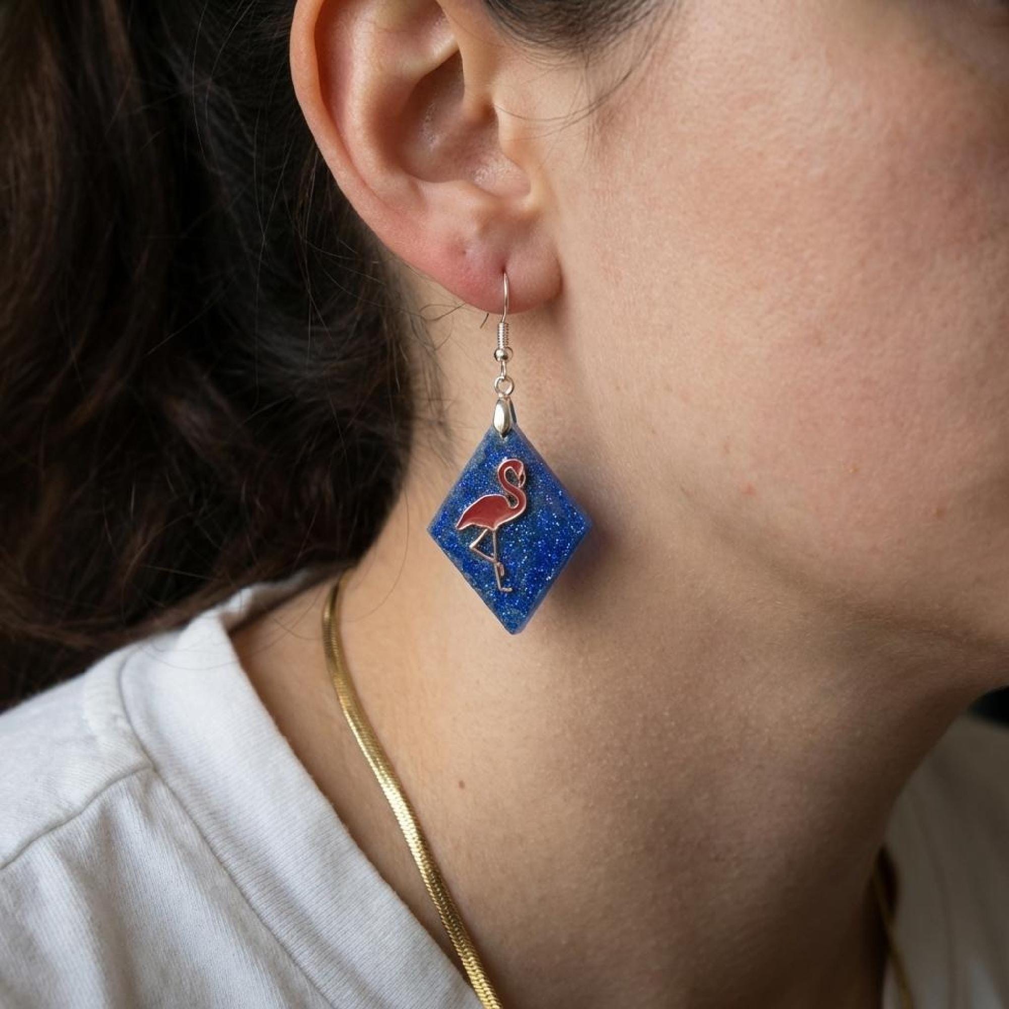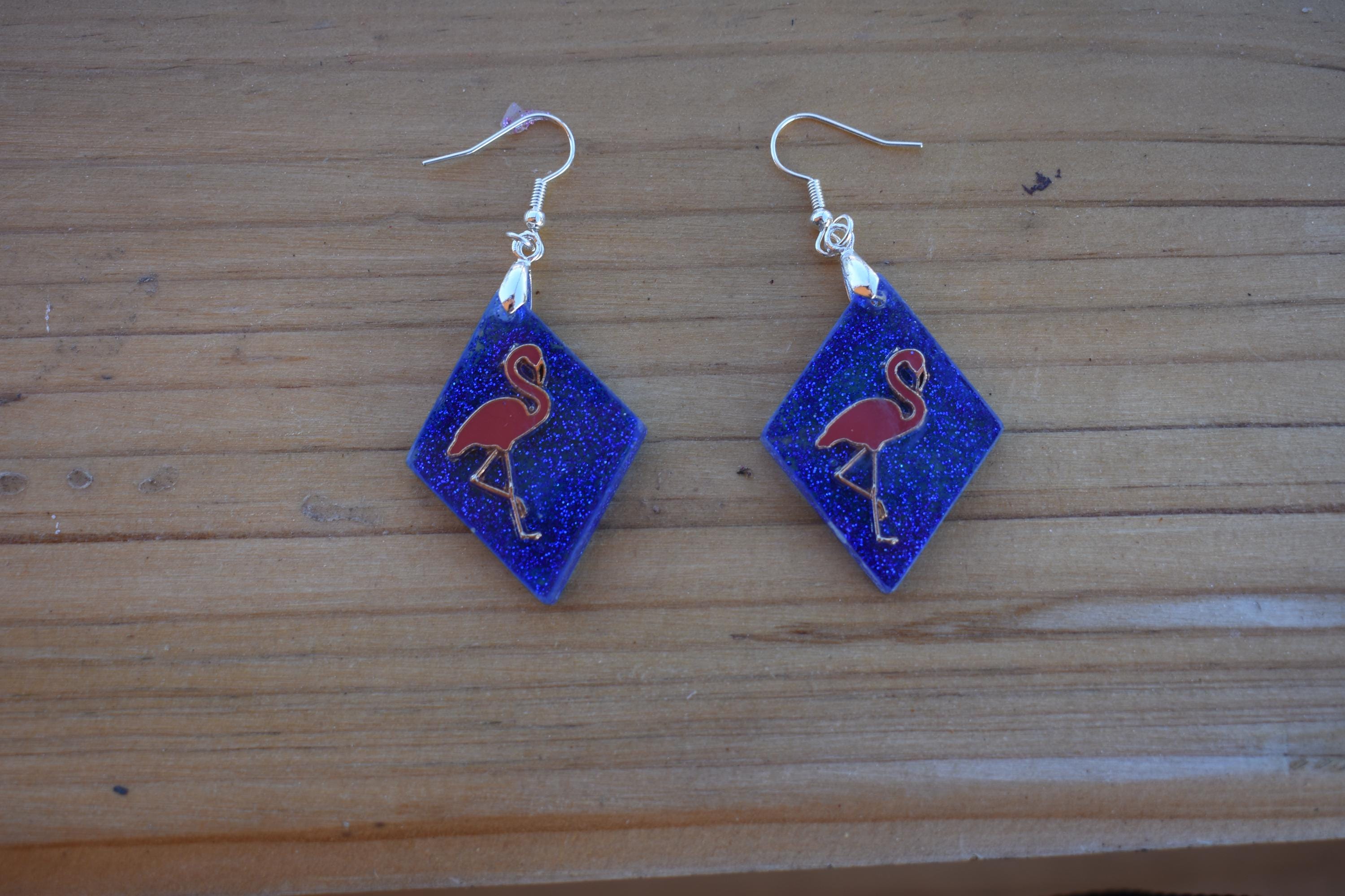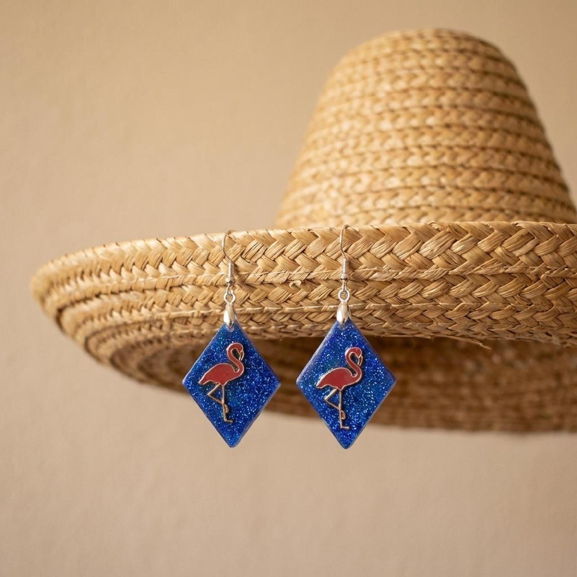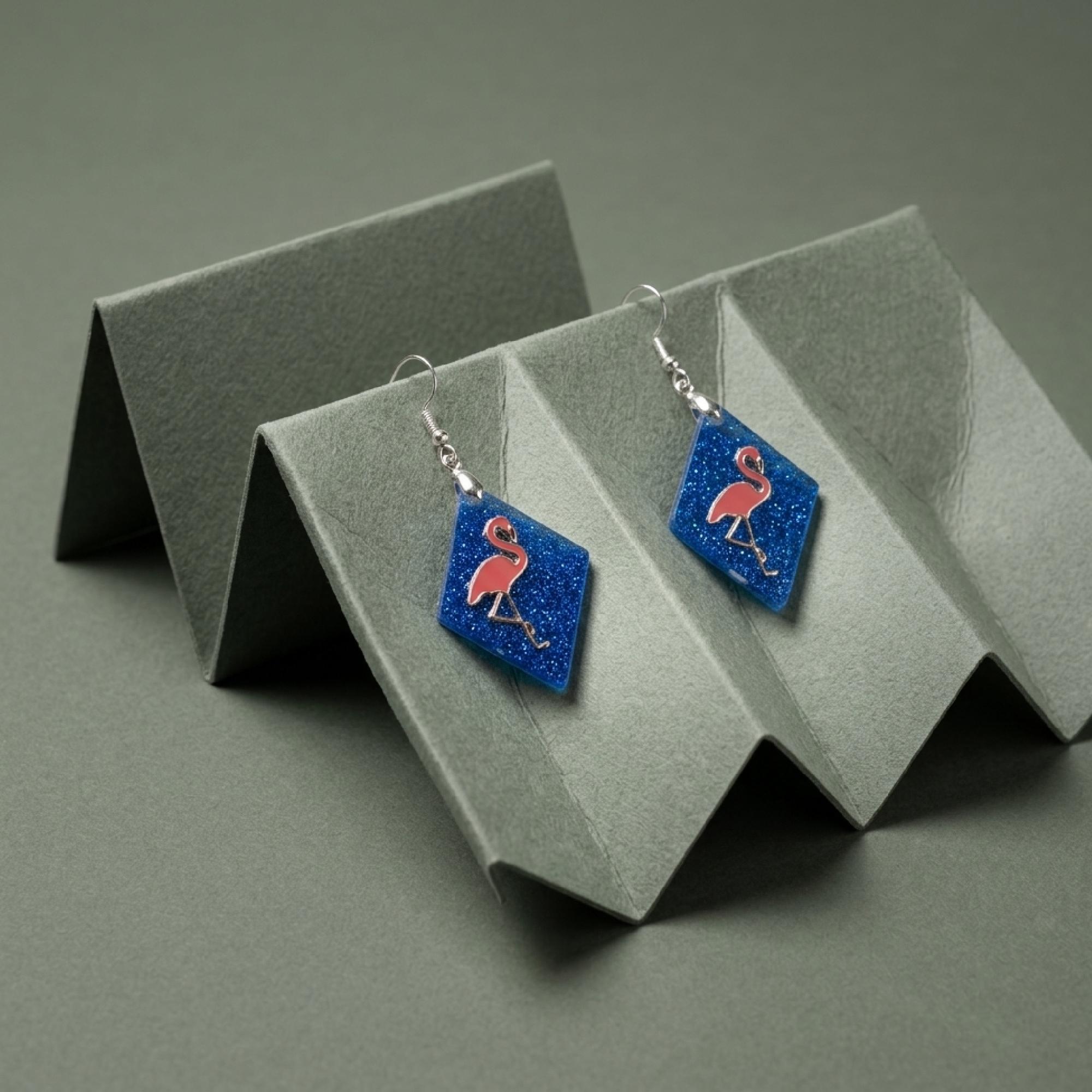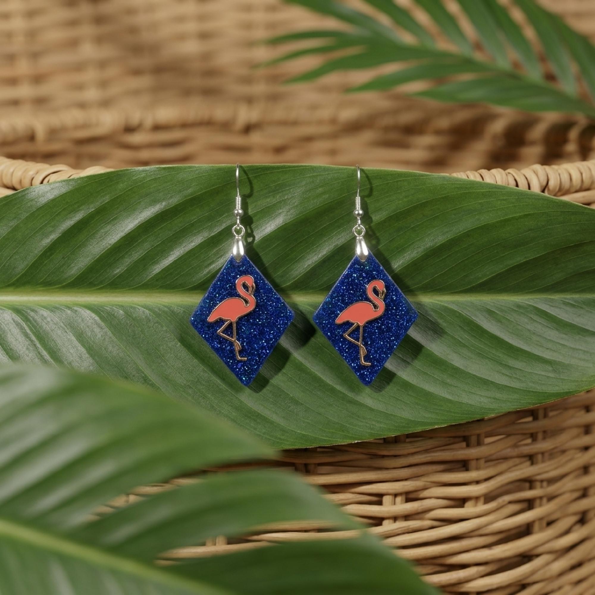 Whether you are packing for the beach, dressing up a weekend look, or adding personality to your daily style, this diamond shape drop design is ready to join every sunny moment.Crafted with meticulous attention to detail, these resin product earrings present a unique blend of artistry and style. The dangle/drop design features a serene flamingo, complemented by a blue background, both rendered in a high-quality resin that captures the essence of elegance.