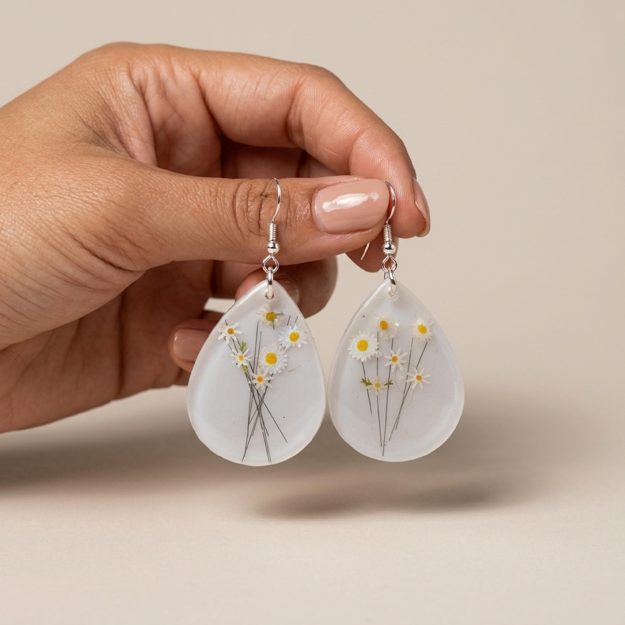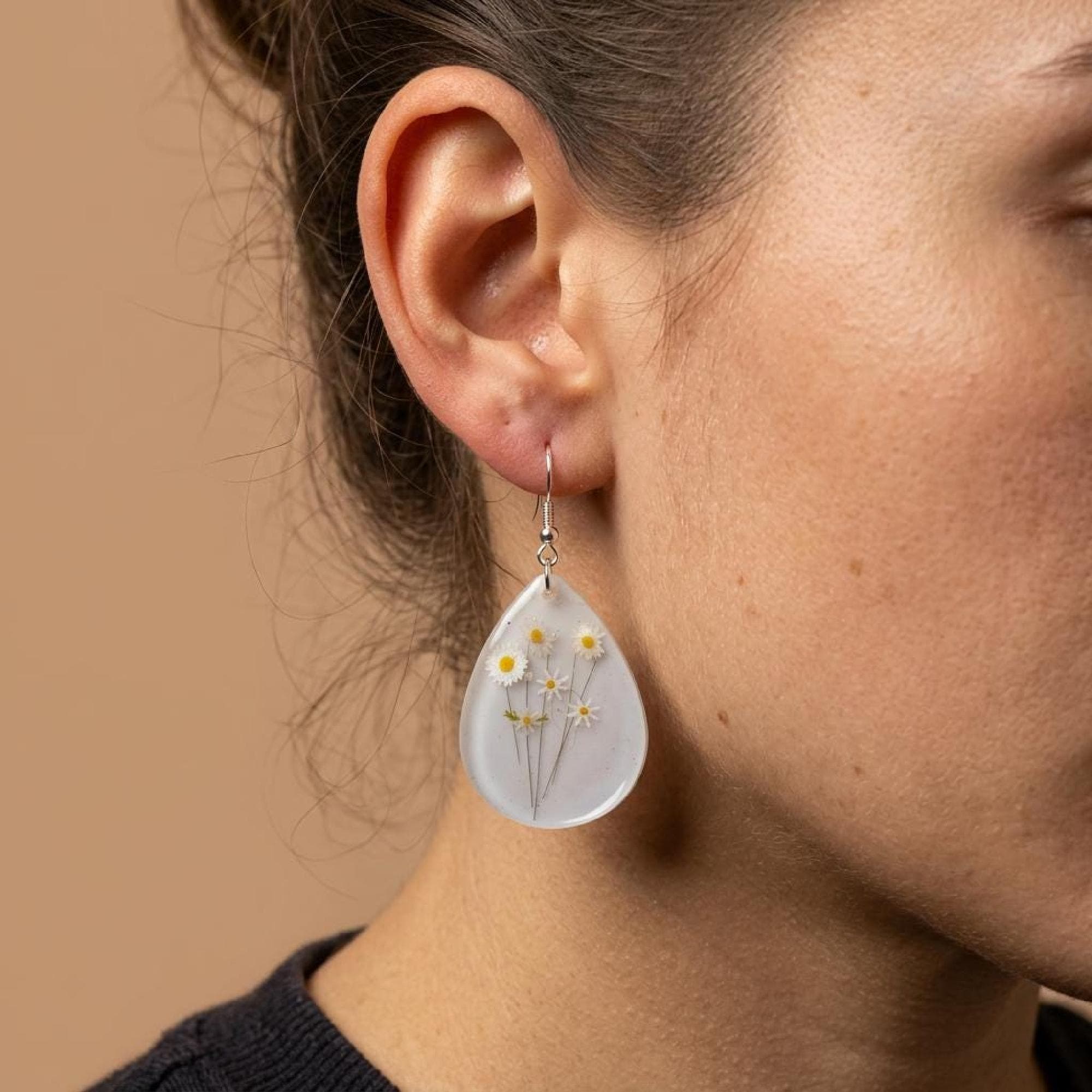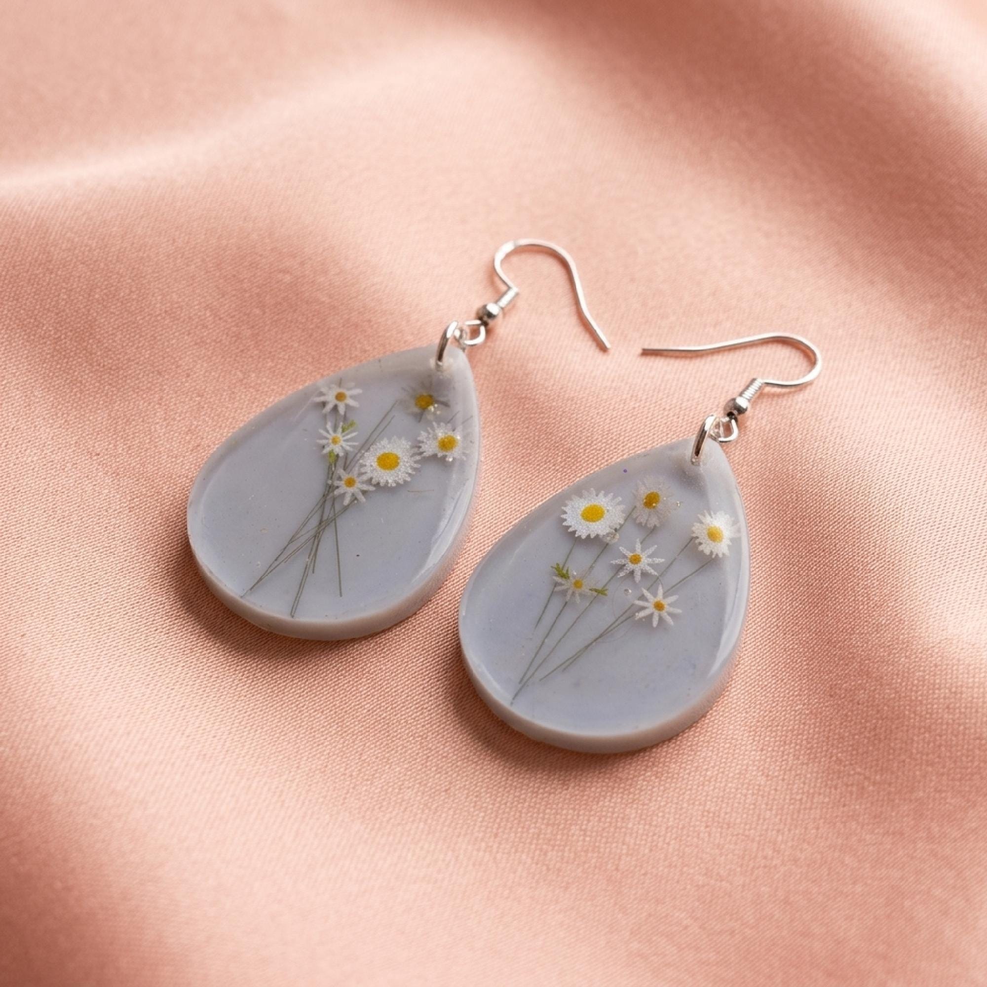Each pair is created with hand poured resin and colored inks to give you gorgeous floral resin drops that look almost like glass look earrings. Think pastel blue jewelry with white blue earrings that catch the light in the prettiest way. The teardrop flower drop design feels delicate and feminine, perfect if you love romantic earrings that still feel modern and easy to wear.
