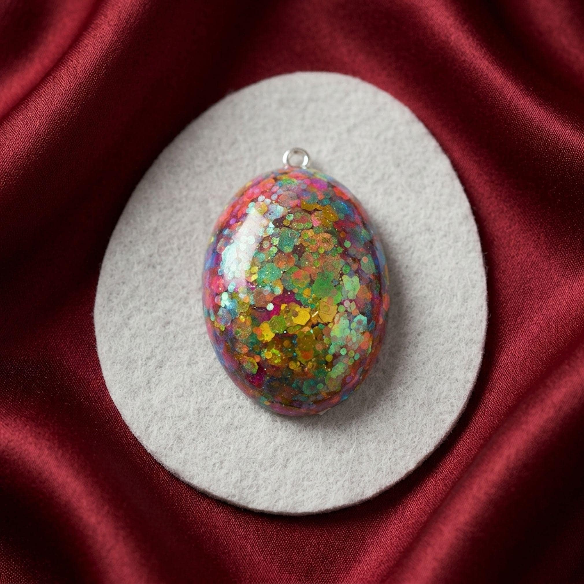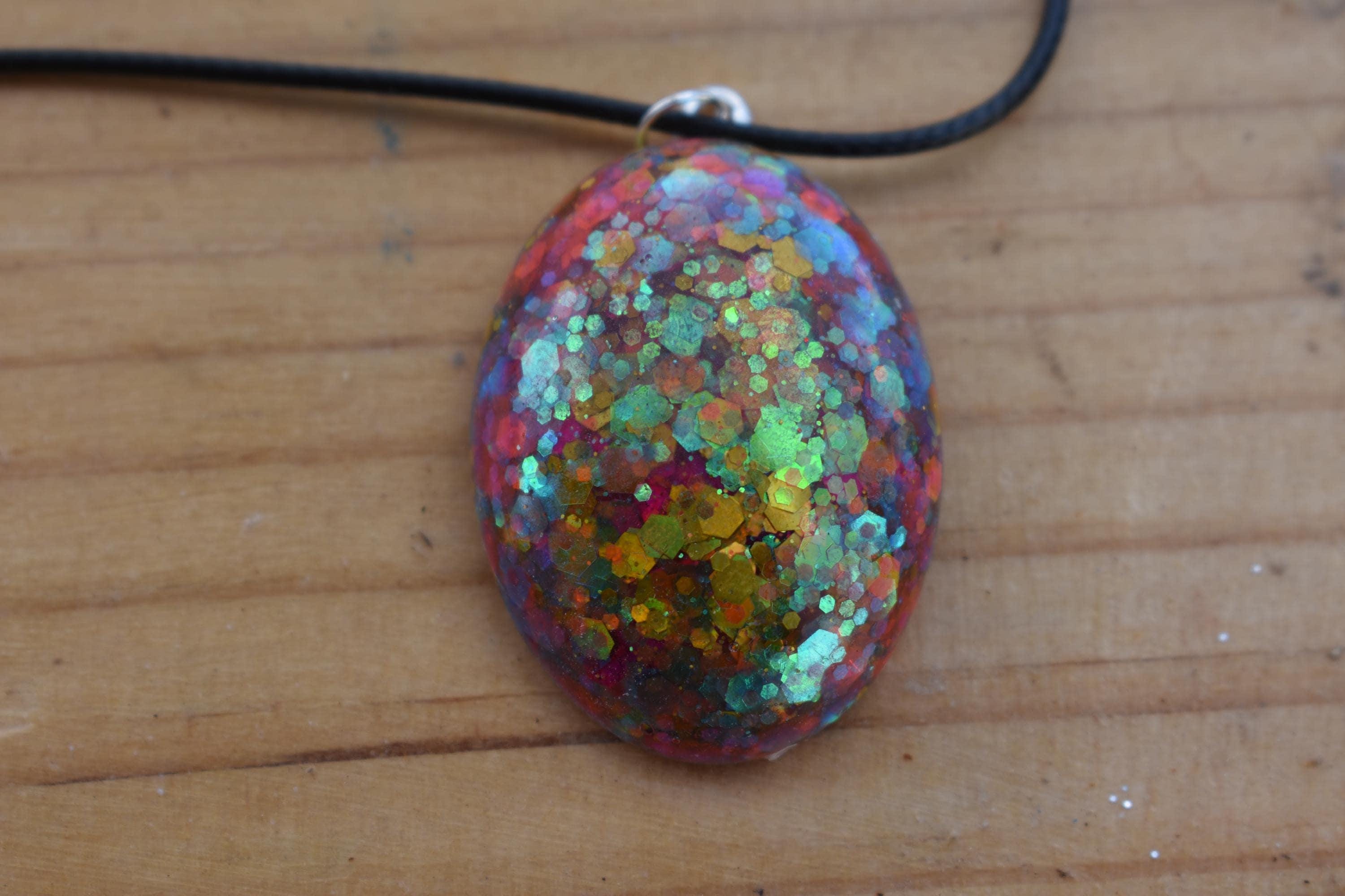 Uv resin necklace with an oval resin pendant created as handmade resin art in my small Australian necklace studio. This black cord necklace features a glossy resin charm filled with iridescent flakes for a subtle shimmer that catches the light and gives you a colorful pendant you can wear with anything.