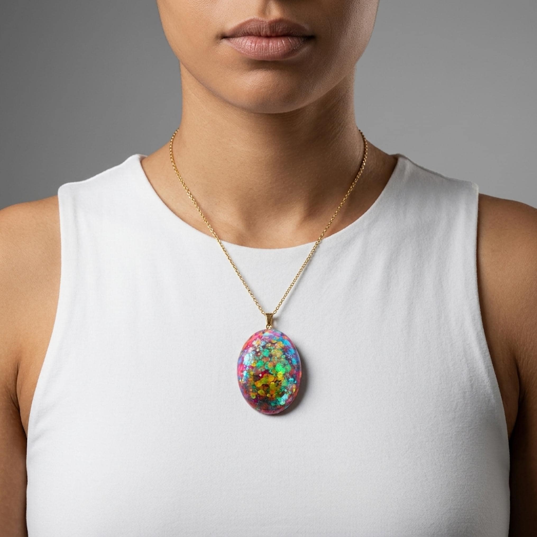 Every uv resin necklace is made individually, so your oval resin pendant will have its own unique pattern of iridescent flakes. Lightweight and easy to wear, this glossy resin charm is designed to be a simple, relaxed piece you reach for every day.Add a subtle pop of colour to your outfit with this australian hand made necklace, crafted from glossy uv resin and rich colour inks. Each pendant is poured and finished by hand, so every piece feels unique and slightly different to the next.