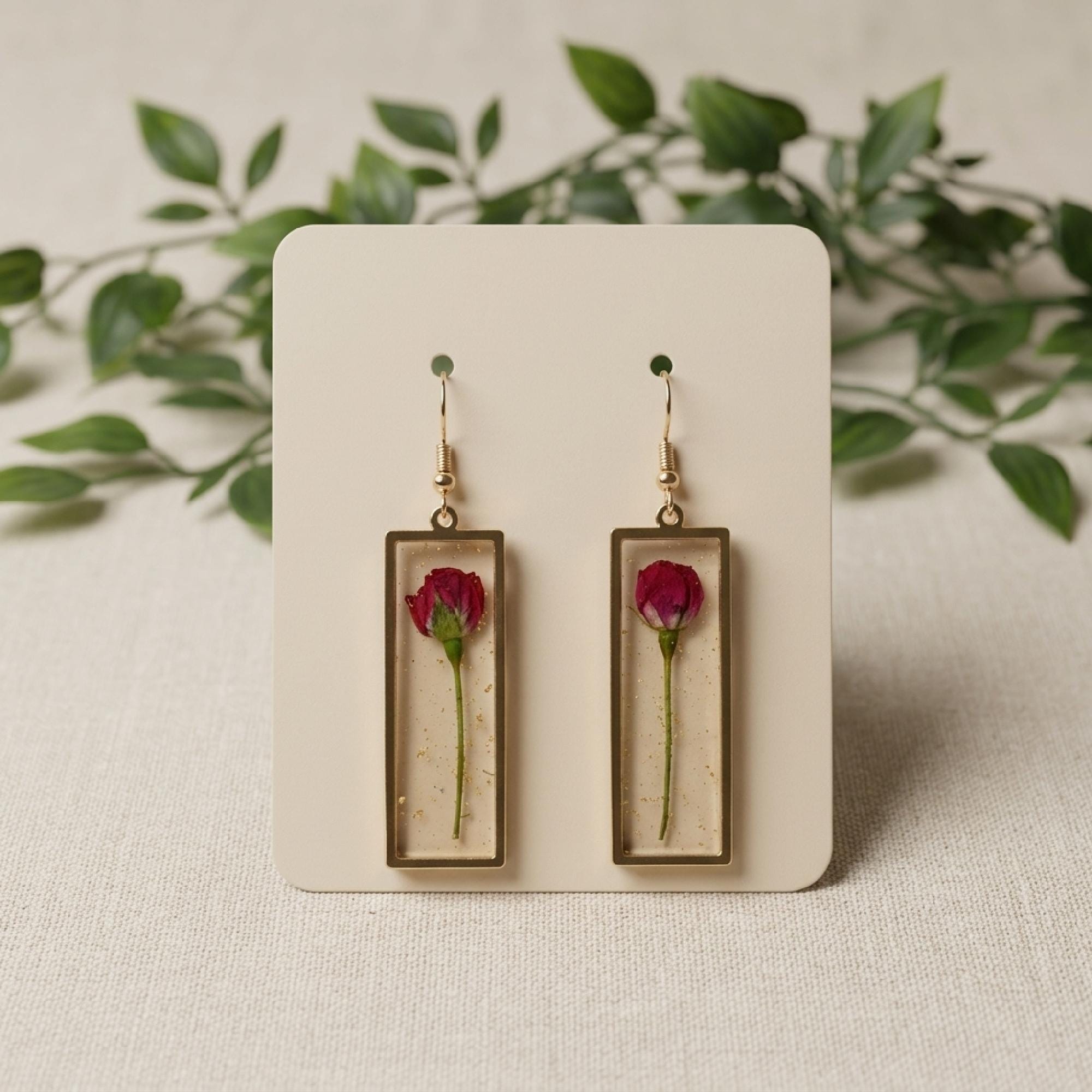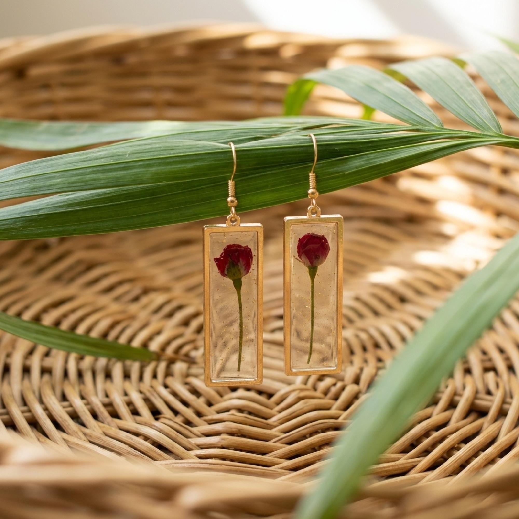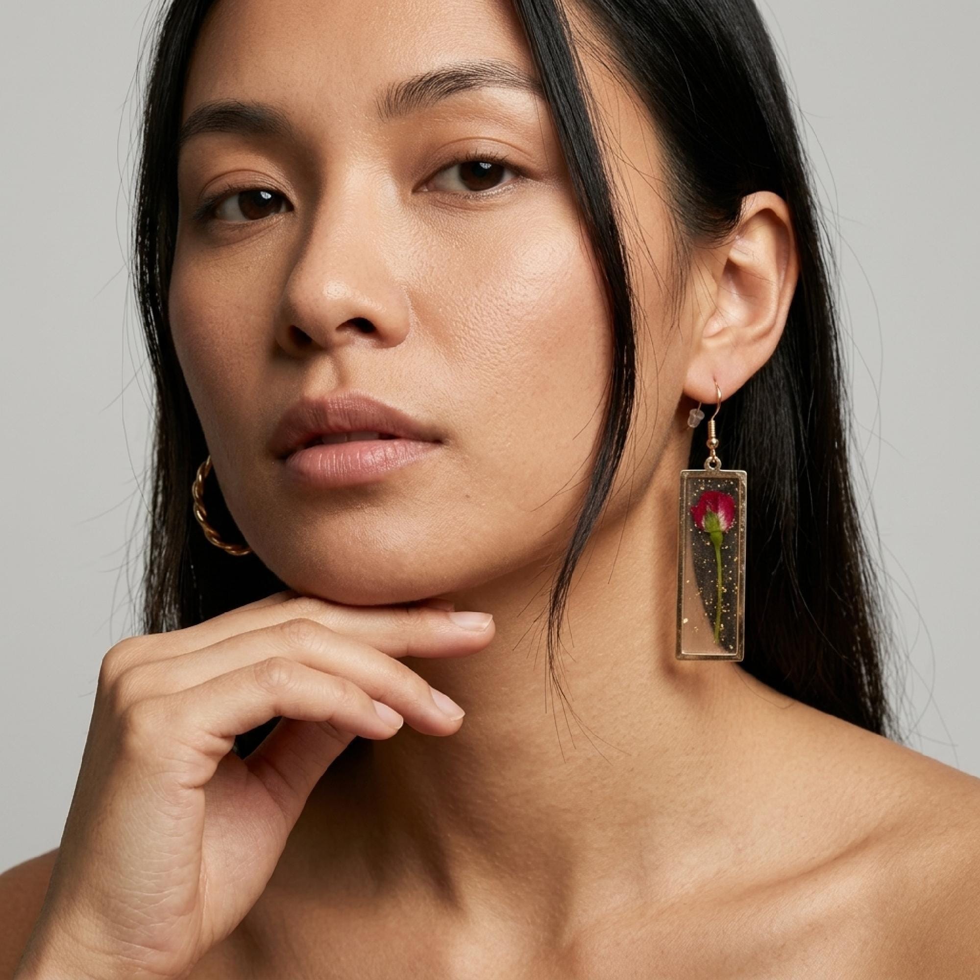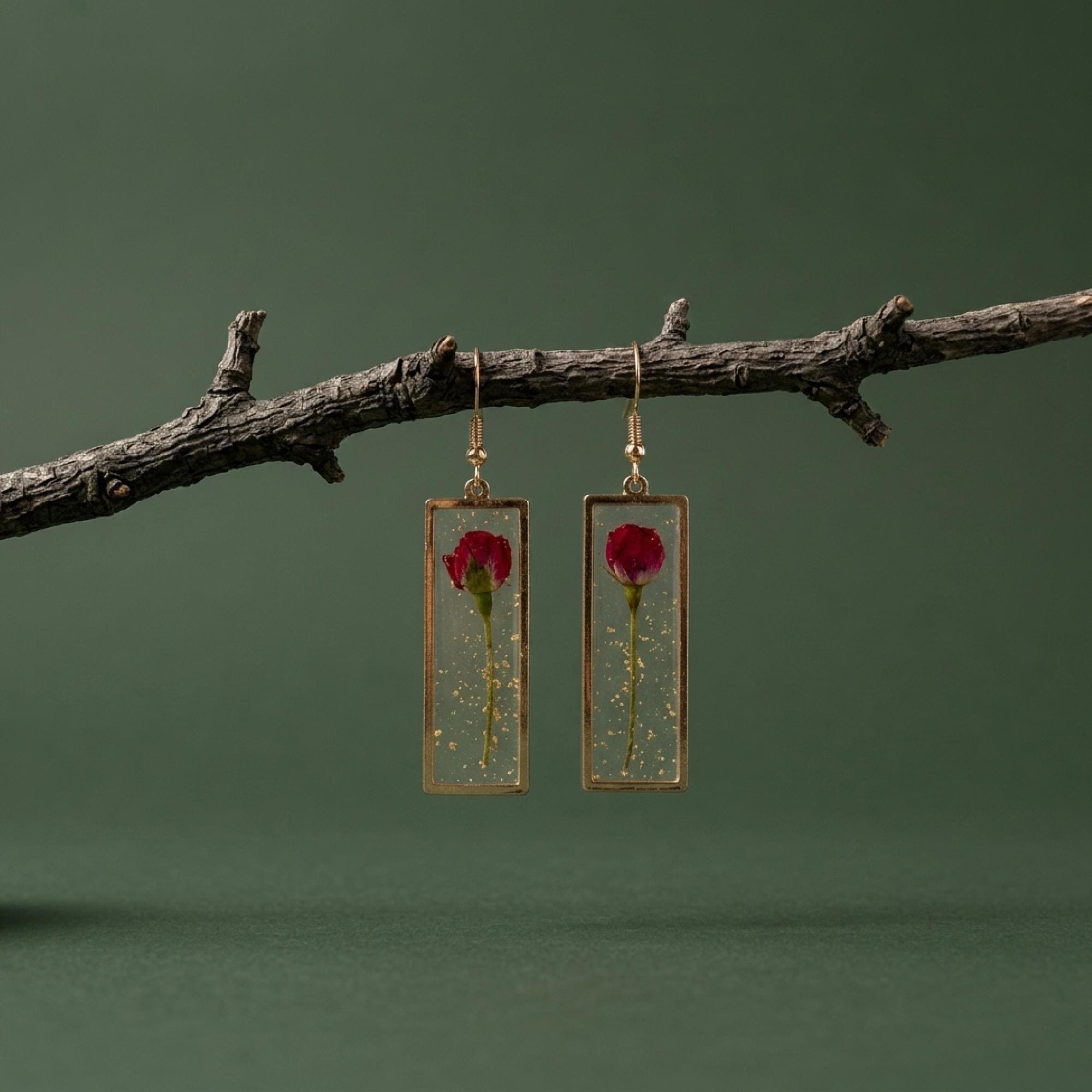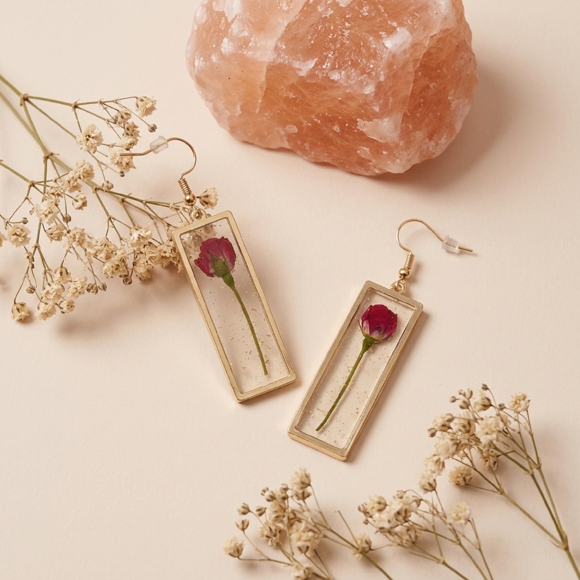 Each pair features a single rose rectangle drop, set within slim gold bezel earrings that catch the light with every movement. The clear resin earrings highlight a delicate flower drop inside, preserving the soft pink petals as if they were floating. Their clean, rectangular earrings silhouette and polished gold frame earrings setting create a refined balance of charm and elegance.