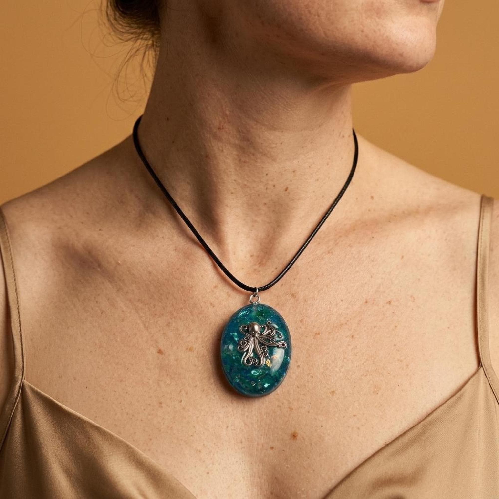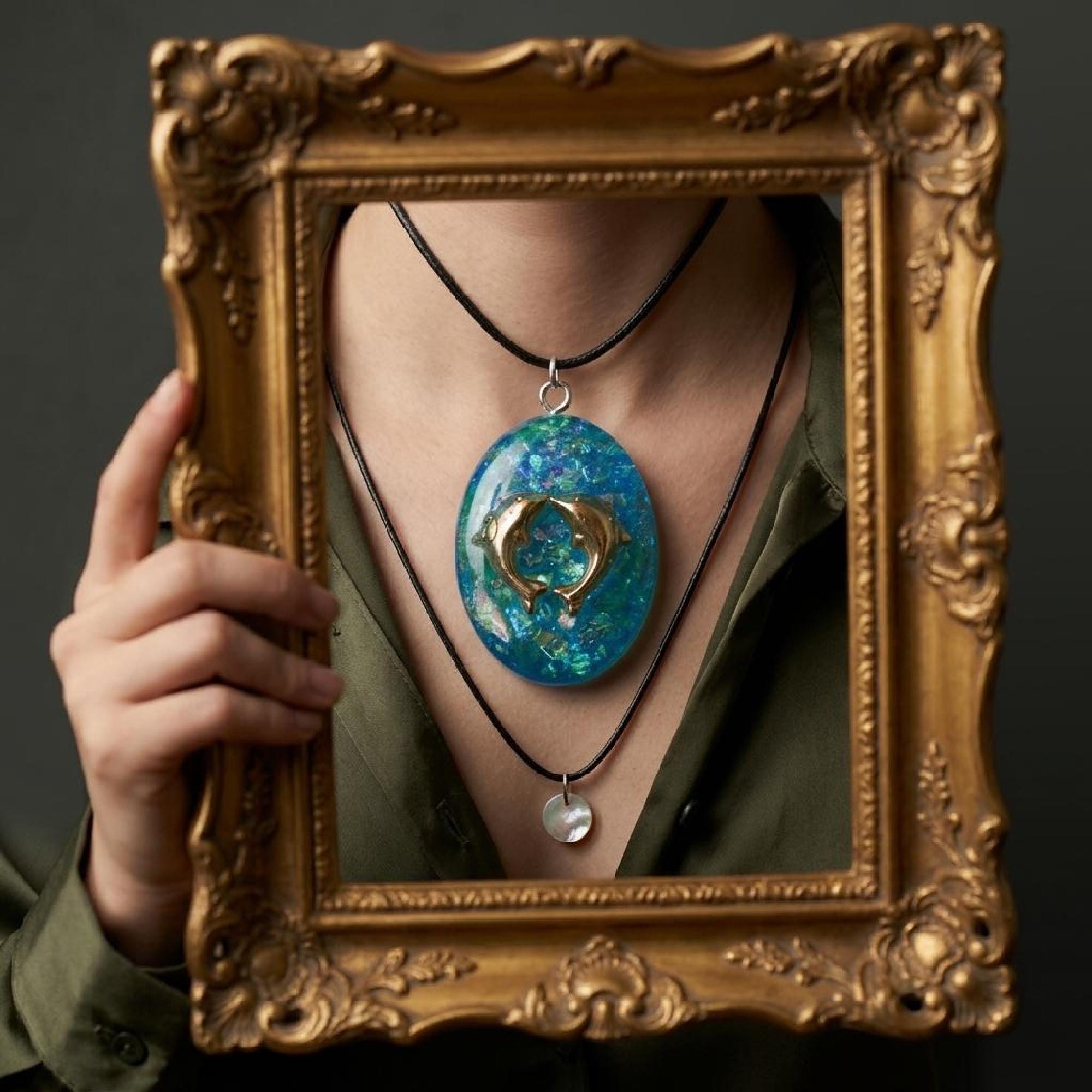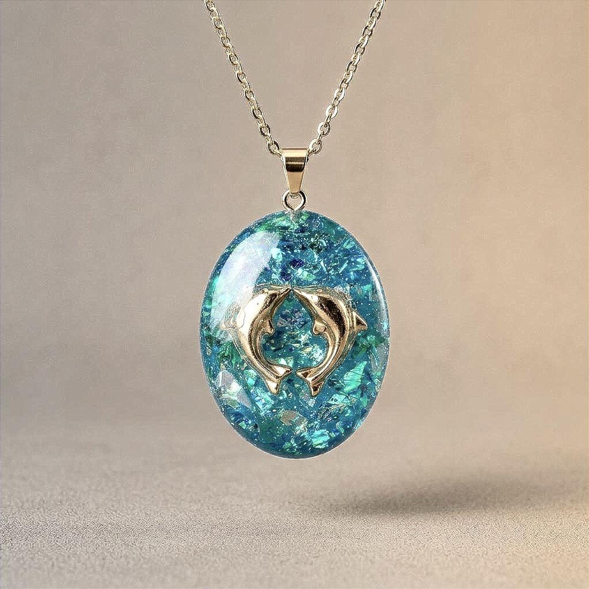 The oval resin pendant is handmade with UV resin in a rich teal blue that looks a bit like deep water. In the center you get a silver handmade dolphin pendant that gives it a relaxed nautical pendant vibe without feeling too flashy.