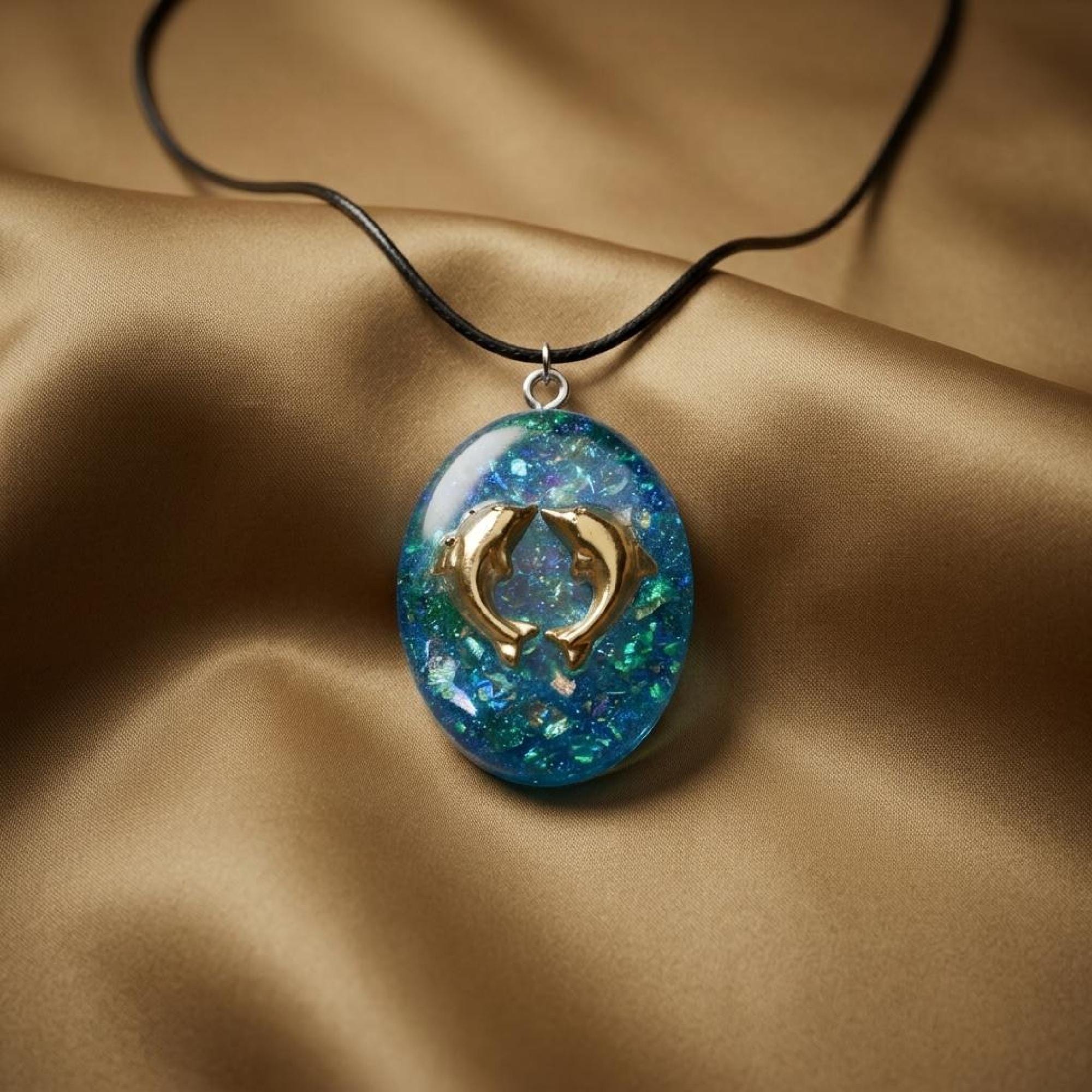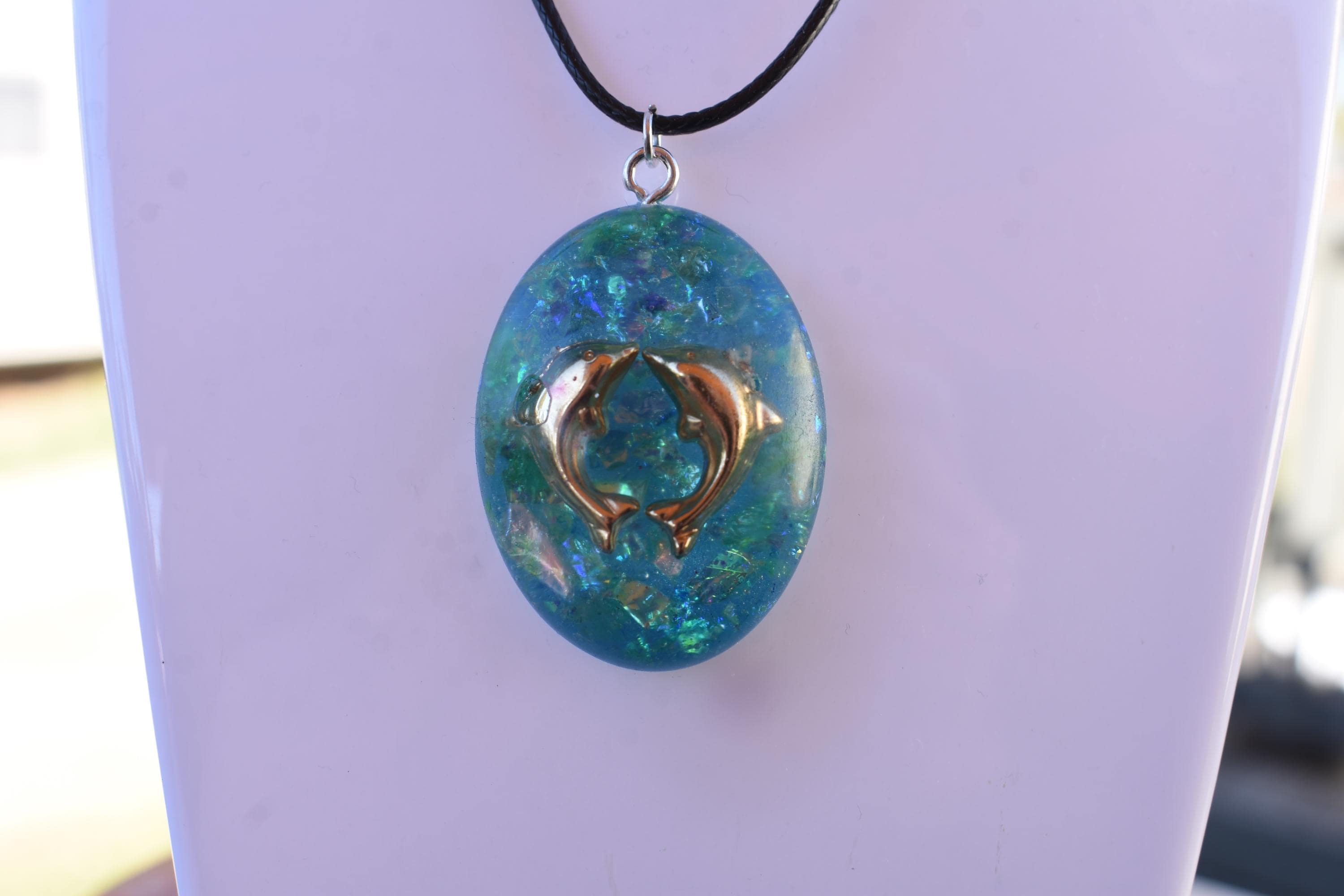 Each piece is slightly different, so your teal blue necklace will feel personal and one of a kind, without trying too hard. teal resin necklace, dolphin pendant, oval resin pendant, teal blue necklace, nautical pendant, ocean lover gift, dolphin charm gift, uv resin jewelry, sea life necklace, marine theme gift, handmade dolphin, black cord necklace, stainless chain
