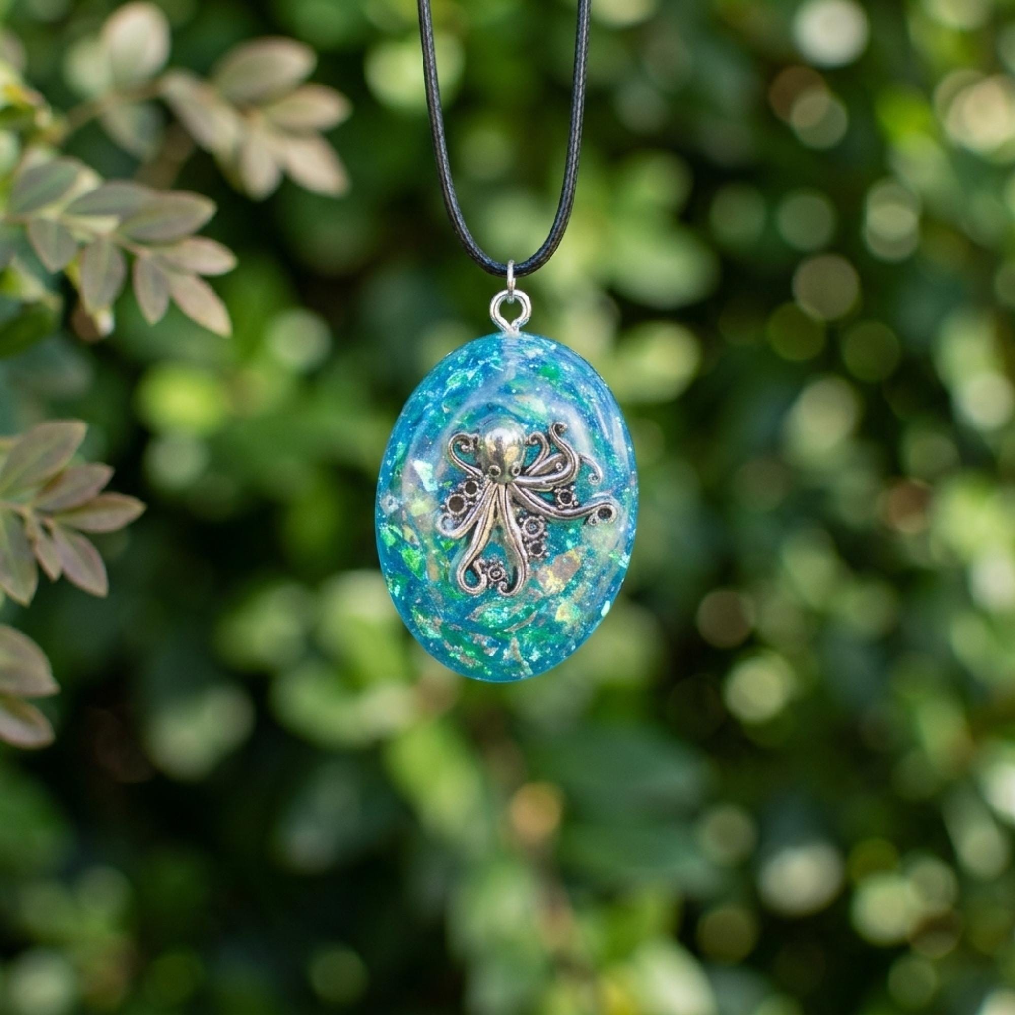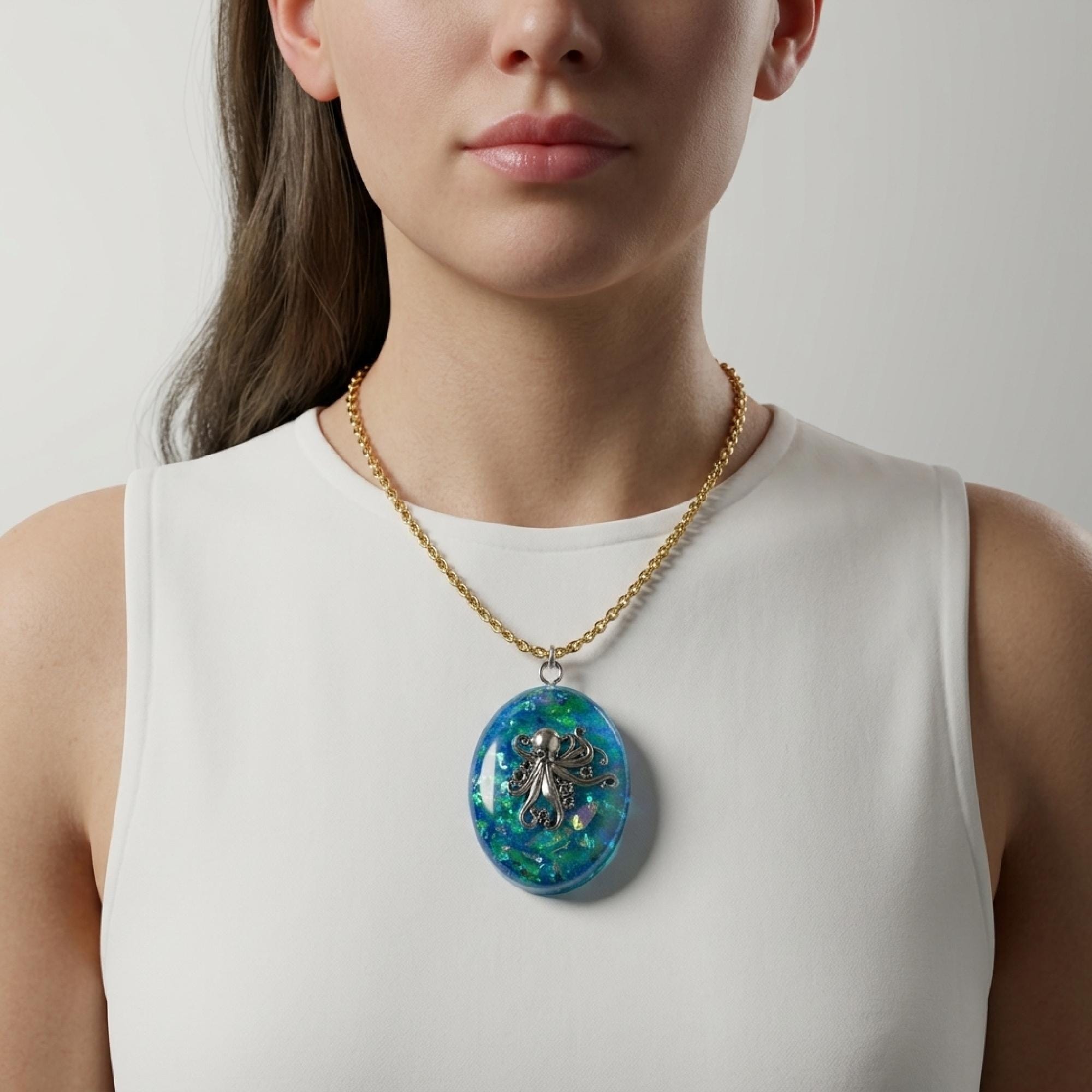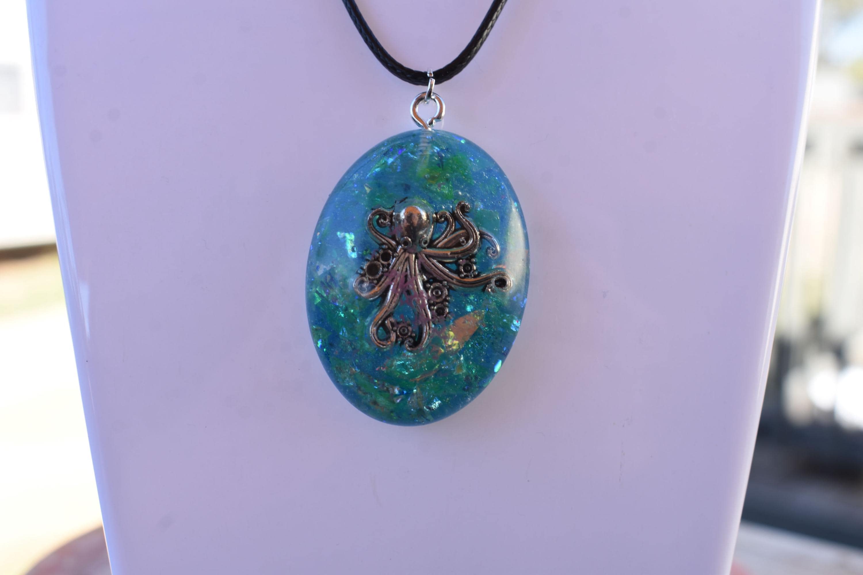octopus necklace, uv resin pendant, teal resin necklace, blue green pendant, octopus jewelry, marine life gift, nautical necklace, ocean lover jewelry, beach style pendant, undersea pendant, sea creature charm, everyday ocean wear, aquatic art pendant