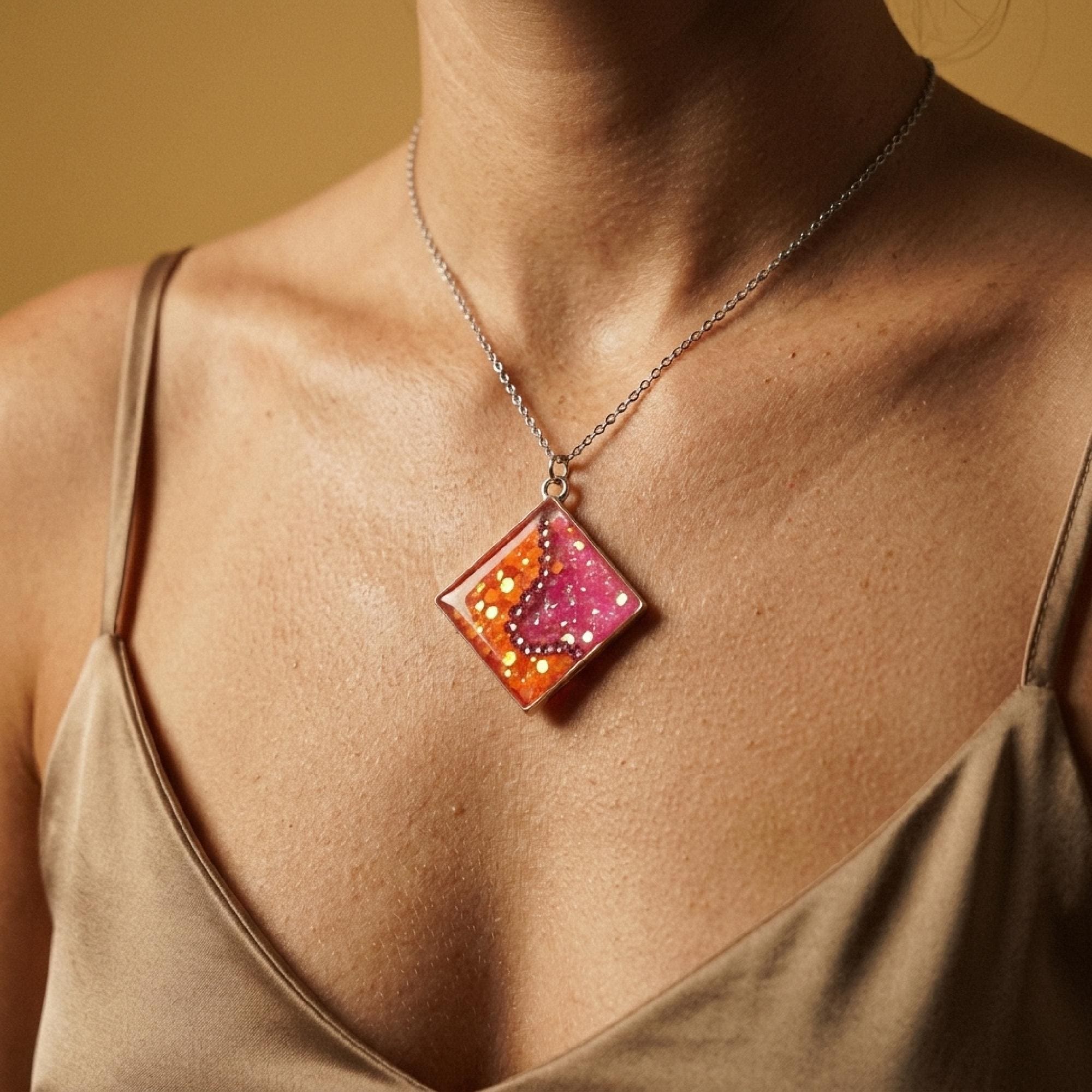 The square resin charm is poured by hand with pink orange resin, loaded with shimmer and shine so you get a sparkly resin charm that really catches the light. It has a soft diamond tilt that gives the glitter pendant a bit of an edge, while still feeling super wearable.