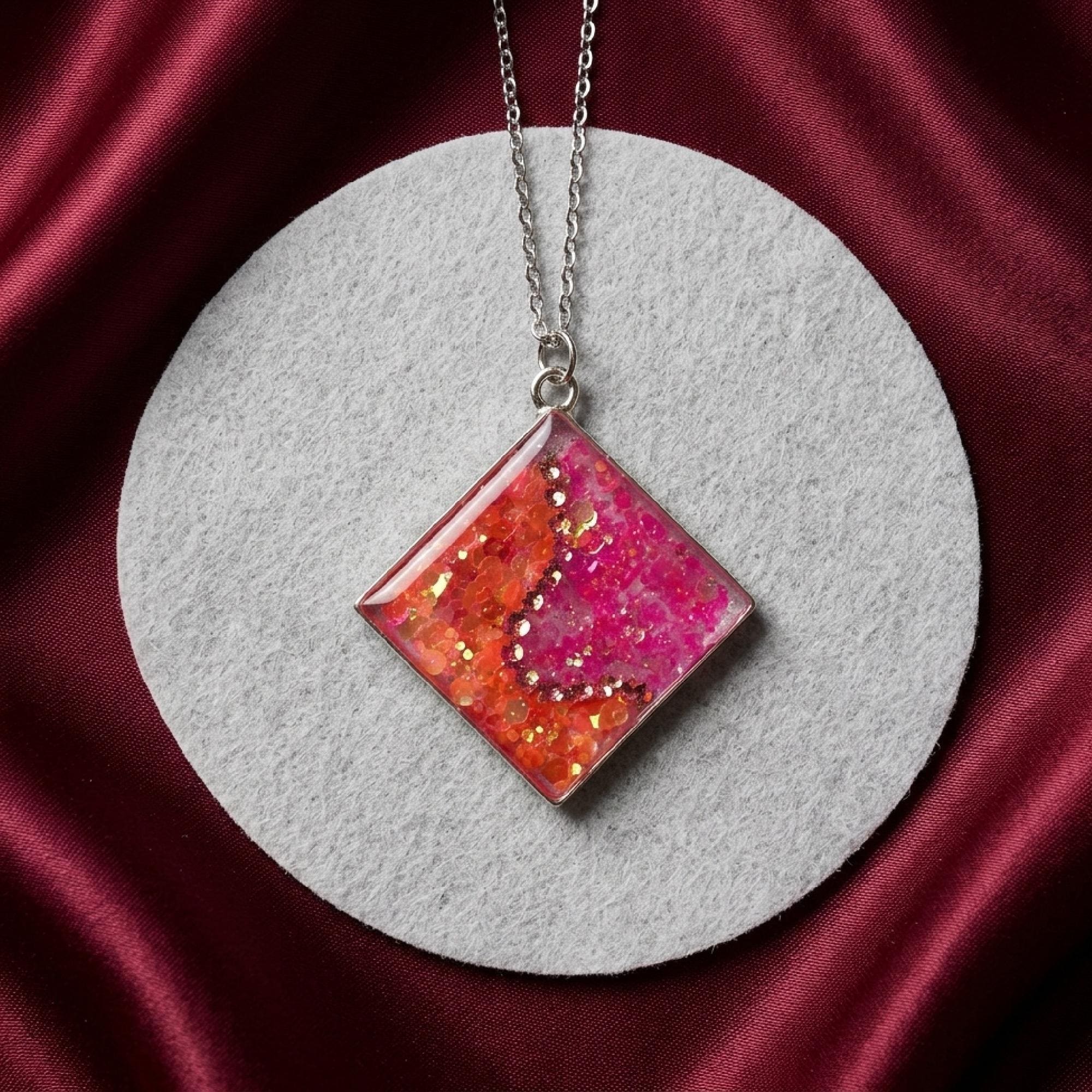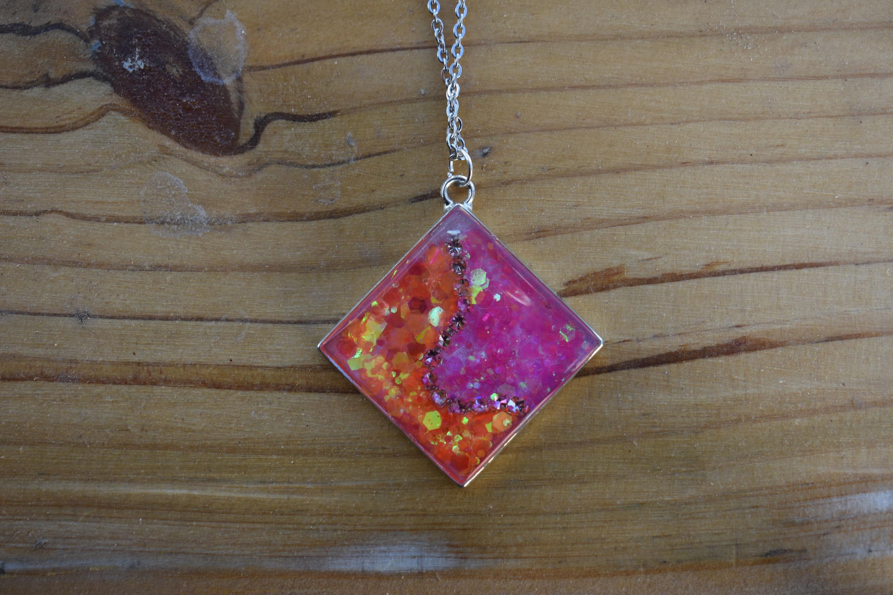 uv resin necklace, resin pendant pink, glitter pendant, pink orange resin, square resin charm, glossy resin jewelry, sparkly resin charm, pink glitter charm, handmade resin art, festival jewelry, orange glitter gift, colorful pendant, gift for teen girl